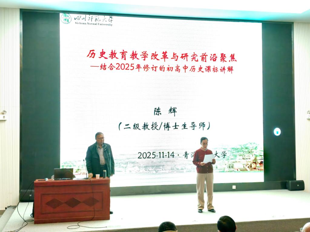 2025年11月,教育部发布了中小学课程方案和课程标准日常修订版,为深入了解修订版义务教育、普通高中、中等职业学校历史课程标准发生的新变化,精准把握课标修订对当前历史教育教学教研的影响,2025年11月14 日上午,青海师范大学历史学院卓越教师培养项目组、青海省历史教师教育虚拟教研室负责人袁亚丽教授特邀四川师范大学二级教授、博士生导师、历史课程研究中心主任陈辉在我校城北校区科技楼报告厅开展题为《历史教育教学改革与研究前沿聚焦——结合2025年修订的初高中历史课标讲解》的学术讲座。本次讲座由青海师范大学历史学院袁亚丽教授主持,中学一线教师、硕士研究生以及本科生260余人参加。